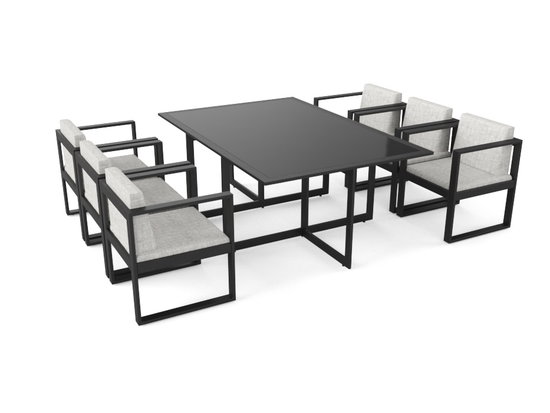 Das Esstisch Set Ricardo verbindet kühle Eleganz und Funktionalität auf perfekte Weise. Es besteht aus einem hochwertigen Tisch mit Alurahmen und Glasplatte sowie sechs komfortablen Sesseln. Das Besondere an diesem Set: Sie können die Möbel komplett zusammenschieben, sodass die Esstisch Gruppe wie ein Würfel erscheint. Das ist äußerst praktisch, wenn Sie die Terrassenmöbel im Winter platzsparend verstauen möchten oder wenn Ihr Terrassenbereich eng bemessen ist.
