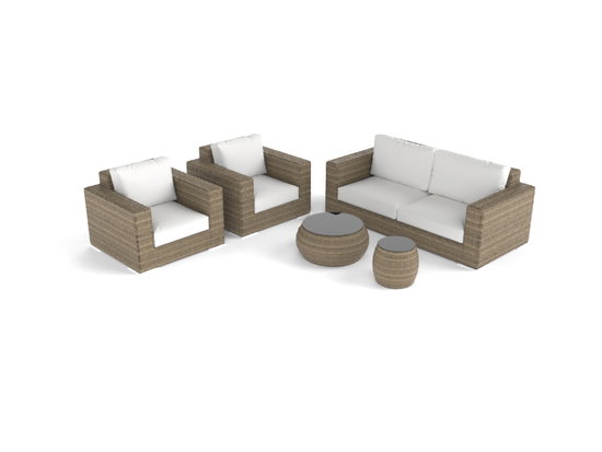 Die Rahmen des Lounge Sets sind aus Aluminium gearbeitet. Rücken- und Seitenbereiche bestehen aus einer Faser rund Natur verarbeitet. Die Couchtische bieten Platz für Ihr Lieblingsgetränk, ein gutes Buch oder auch eine Kleinigkeit zum Naschen. Genießen Sie die schönste Zeit des Jahres und tanken Sie Kraft in Ihrem heimischen Außenbereich - Gerania macht das möglich...