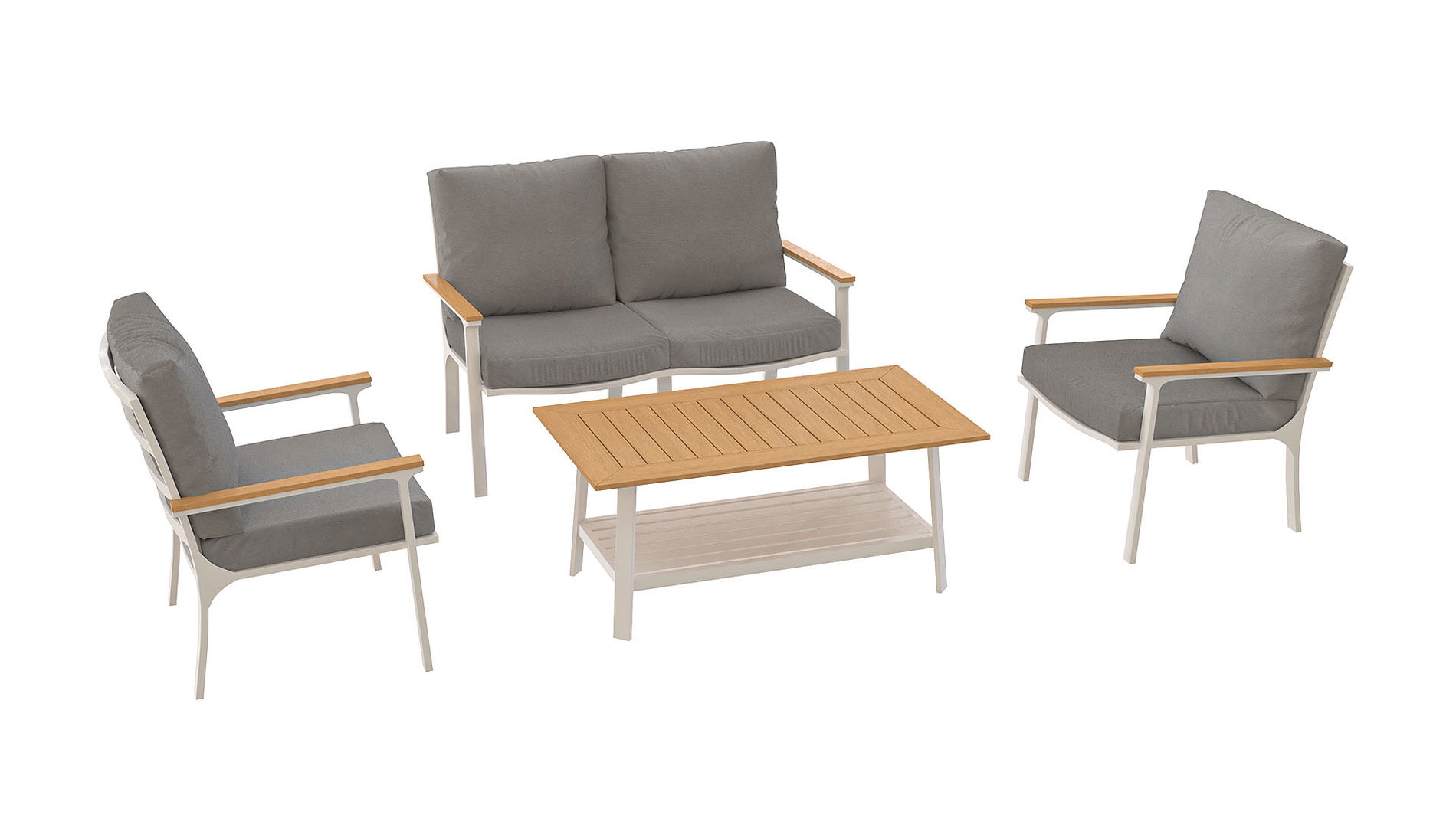 Das komfortable Lounge Set Saida S aus der Ilios Collection versprüht einen einzigartigen Charme. Die Gruppe besteht aus einem 2-Sitzer-Sofa, zwei Sesseln und einem rechteckigen Couchtisch. Die Rahmen aus stabilem Aluminium sind in Weiß gehalten. Die Armlehnen besitzen Auflagen in holzfarbenem Polywood. Die gleiche Oberfläche zeigt sich auch auf dem Tisch. Sitzflächen und Rückenbereich präsentieren sich mit komfortablen Polstern in unempfindlichem Rauchgrau.