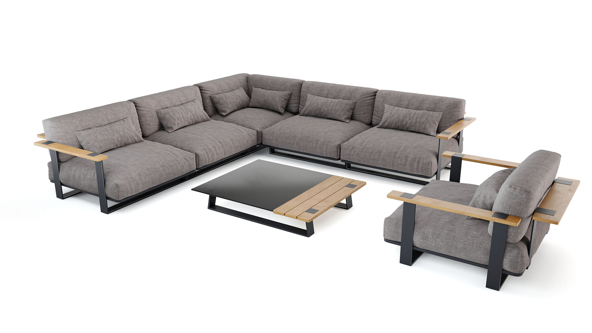 Das robuste Gestell aus pulverbeschichtetem Aluminium in elegantem Anthrazit bildet die Grundlage für ein langlebiges und wetterfestes Möbelstück. Edle Details aus massivem Teakholz zieren die Rücken- und Armlehnen, sowie waagerechte Ablagen, die nicht nur praktisch sind, sondern das Gesamtbild harmonisch abrunden. Diese durchdachten Akzente machen die Aura Lounge zu einem echten Hingucker – ein Möbelstück, das zum Bewundern einlädt.