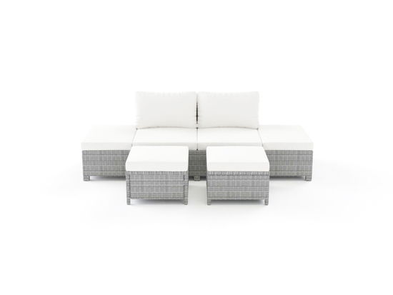Die komfortablen Outdoormöbel besitzen einen stabilen Rahmen aus Aluminium sowie eine Bespannung aus meliertem City Polyrattan. Cremefarbene Polster auf den Sitzflächen und im Rückenbereich runden den Luxus perfekt ab. Das modulare Set ist vielseitig wandelbar, sodass die Liege bzw. das 3-Sitzer-Sofa auch als 2-Sitzer-Sofa mit seitlichen Abstellflächen genutzt werden kann. Gleiches gilt für die Hocker, die ohne Polster als Couchtisch dienen. Hierfür wird ein Hocker zusätzlich mit einer Glasplatte geliefert, die sich bei Bedarf als Tischplatte nutzen lässt.