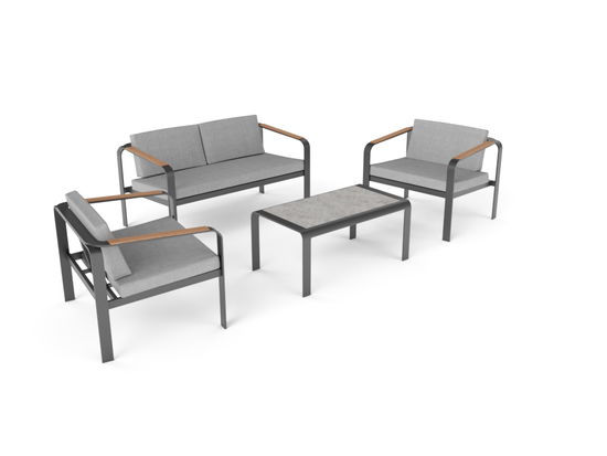 Die Rahmen der Tischgruppe sind aus robustem Aluminium gefertigt. Aluminium zeichnet sich durch seine starke Belastbarkeit und Witterungsbeständigkeit aus. Die Armlehnen der Sitzmöbel sind mit natürlichem Teak bedeckt und bieten eine angenehme Haptik.