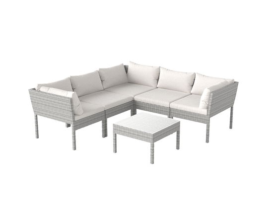 Bei dem Lounge Set Fantasia aus der New Classics gehen stylisher Charme und gemütlicher Komfort Hand in Hand. Das großzügige Design des Polyrattan Gartensofas sieht nicht nur gut aus, sondern ist auch noch qualitativ bemerkenswert: Das rostfreie und Pulver beschichtete Gestell aus Aluminium ist leicht, robust, wetterfest und UV-resistent. Die kuschelige Gruppe setzt sich aus zwei Eckteil-Sofas, einer zentralen Ecke, zwei Mittelecken und einem quadratischen Couchtisch mit Glasplatte zusammen.