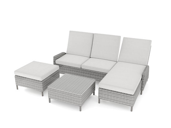 Das Lounge Set Pimena aus der Classics Collection verleiht jedem Außenbereich und auch Wintergärten ein behagliches, einladendes Flair. Die Gruppe setzt sich aus einem 2-Sitzer-Sofa, einem komfortablen Liegesofa einem Couchtisch mit Glasplatte und einem Fußschemel zusammen. Über einen seitlichen Riegel lassen sich die Rückenlehnen bei Bedarf neigen und den jeweiligen Bedürfnissen anpassen. Das hübsche Lounge Set benötigt nicht viel Stellfläche, bietet jedoch ein Maximum an Komfort.