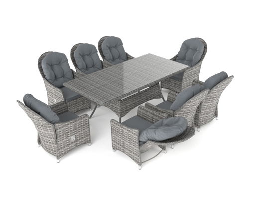Ein eckiger Tisch, eine schicke Kombination von acht Stühlen mit verstellbaren Rückenlehnen, die eher als Sessel bezeichnet werden: So lässt es sich bestens miteinander reden, während Sie Kuchen essen oder Fingerfood genießen.