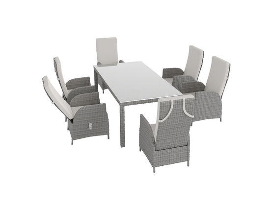Genießen Sie Ihre Mahlzeiten unter freiem Himmel und erfreuen Sie sich an dem eleganten Esstisch Set Ceres Relax L aus der Classics Collection. Die komfortable Gruppe besteht aus sechs Armlehnstühlen mit hoher Rückenlehne sowie einem extra großen Tisch mit eleganter Klarglasplatte und dicken hellen Polstern für die Bestuhlung. Die verstellbare Rückenlehne lässt sich mittels Riegel im Seitenbereich der Sessel individuell bedienen. Eleganz und Komfort gehen bei diesem Modell Hand in Hand – ein Luxus, den Sie sich nicht entgehen lassen sollten.
